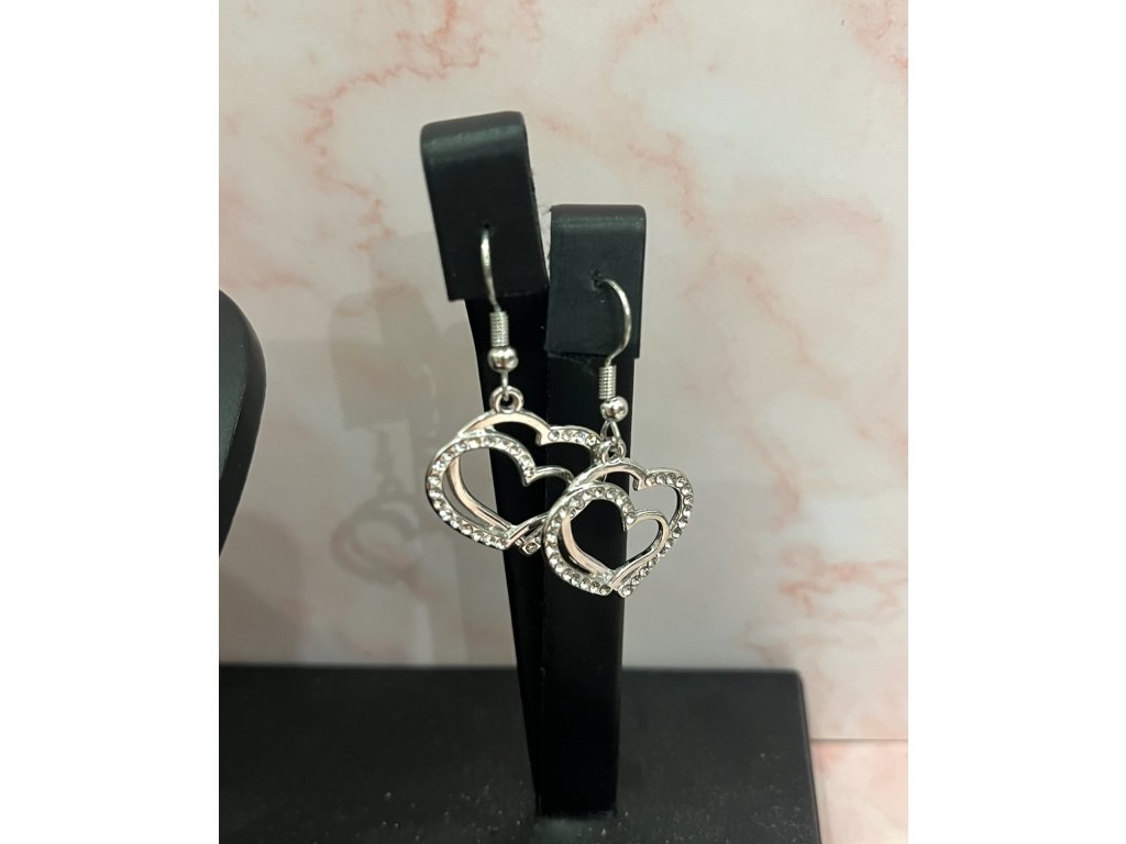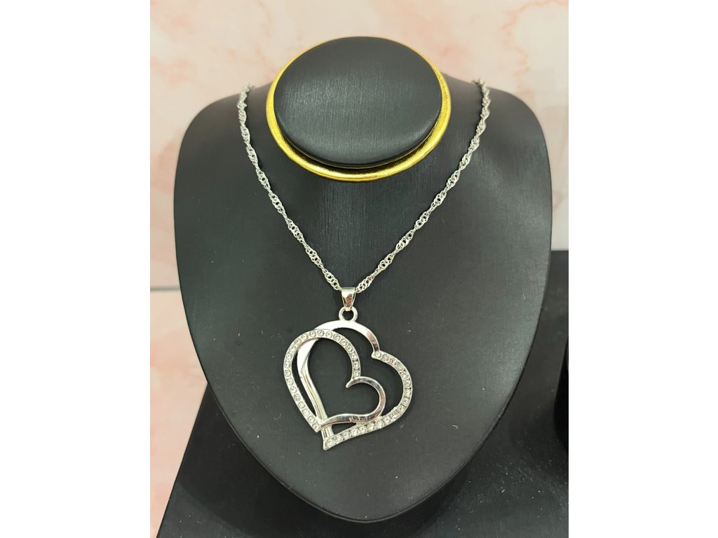 Kettős szív alakú medálja finoman öleli egymást, a körvonalat apró kristályok díszítik, melyek minden fényben gyönyörűen tündökölnek.