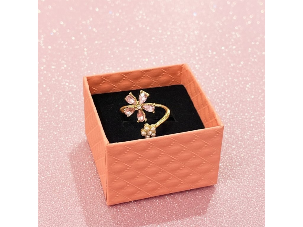 A Blush Bloom gyűrű egy igazán romantikus, mégis letisztult ékszer. Az arany színű alapot finom, rózsaszín kövekből kirakott virág díszíti, amely könnyed eleganciát ad a megjelenésnek.