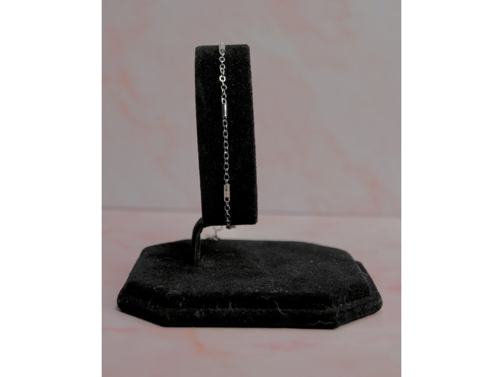 Finom ezüst lánc, apró hengeres díszítéssel, amely egy leheletnyi fényt és kifinomultságot ad a csuklónak.