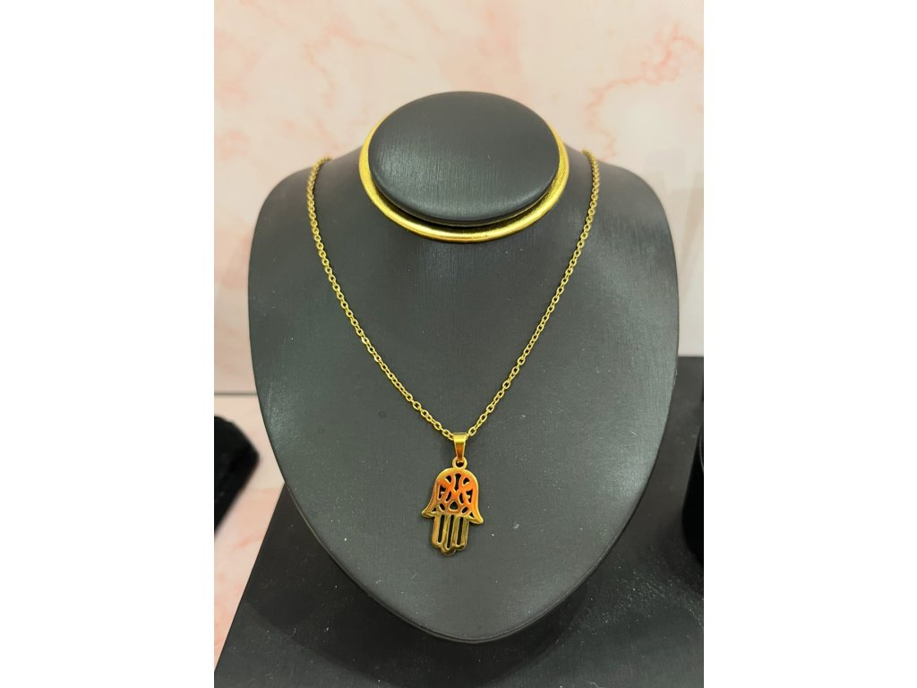 A Hamsa kéz motívuma világszerte a védelem, a jó szerencse és a harmónia szimbóluma. Ez az elegáns, arany bevonatú ékszerszett rozsdamentes acélból készült, így nem kopik, nem színeződik, és érzékeny bőrre is biztonságos. A szett tartalmaz egy medálos nyakláncot és egy hozzá illő bedugós fülbevalót, ezért ajándéknak is tökéletes – legyen szó születésnapról, ballagásról vagy akár önmagad megajándékozásáról.