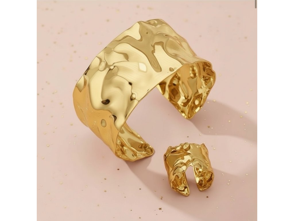 A Golden Wave ékszerszett az időtlen elegancia és a modern formavilág tökéletes találkozása. A széles, hullámos felületű arany színű karkötő és a hozzá illő gyűrű különleges fényt ad a kéznek, miközben kifinomult és nőies hatást kelt.