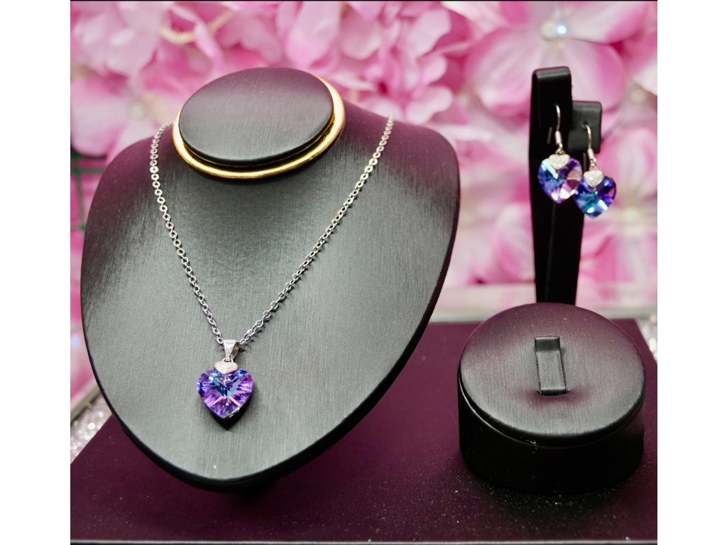 A Luna Violet szett a nőiesség és a csillogás találkozása. A gyönyörű, szív formájú kristályok lila és kék árnyalatai játékosan tükrözik a fényt, ezzel elegáns, mégis fiatalos megjelenést adva viselőjének. A nyaklánc és a hozzá illő fülbevaló tökéletes harmóniát alkot, így akár ajándékként, akár saját kedvenc kiegészítőként is tökéletes választás.