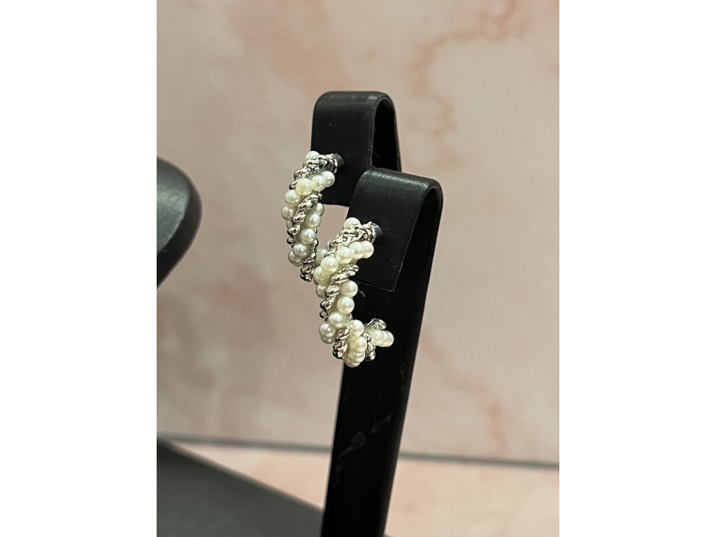 A Pearl Twist Hoops egy finoman csavart, ezüst színű karika fülbevaló, amelyet apró gyöngyök díszítenek körkörösen.